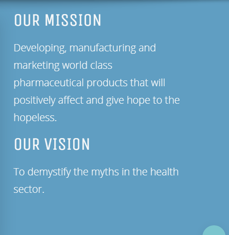 In pursuit of this vision, we have developed our first drug, Mystomate4 which has been proven to be efficacious in treating ulcers, gastritis, and gastro-esophageal reflux disease and those that have used it are testifying to its effectiveness and quick action.